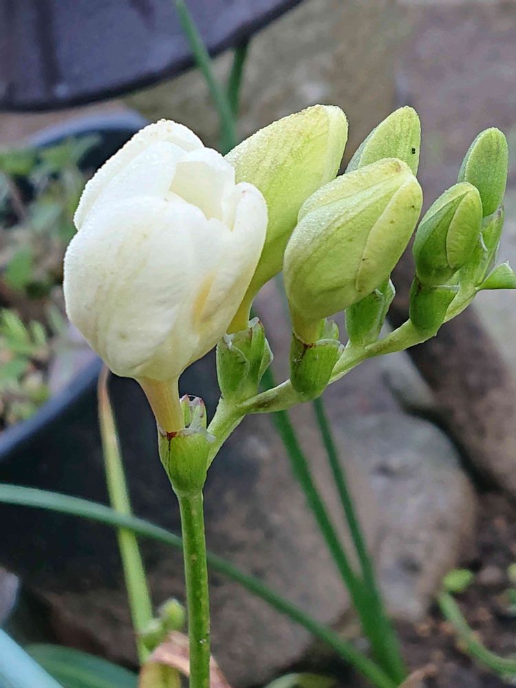 球根コーナーの隅っこで😊やっと蕾が😊