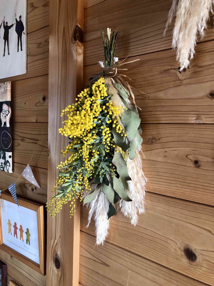 お友達にもらったミモザのお花💛にユーカリとパンパスグラスを添えて‼︎