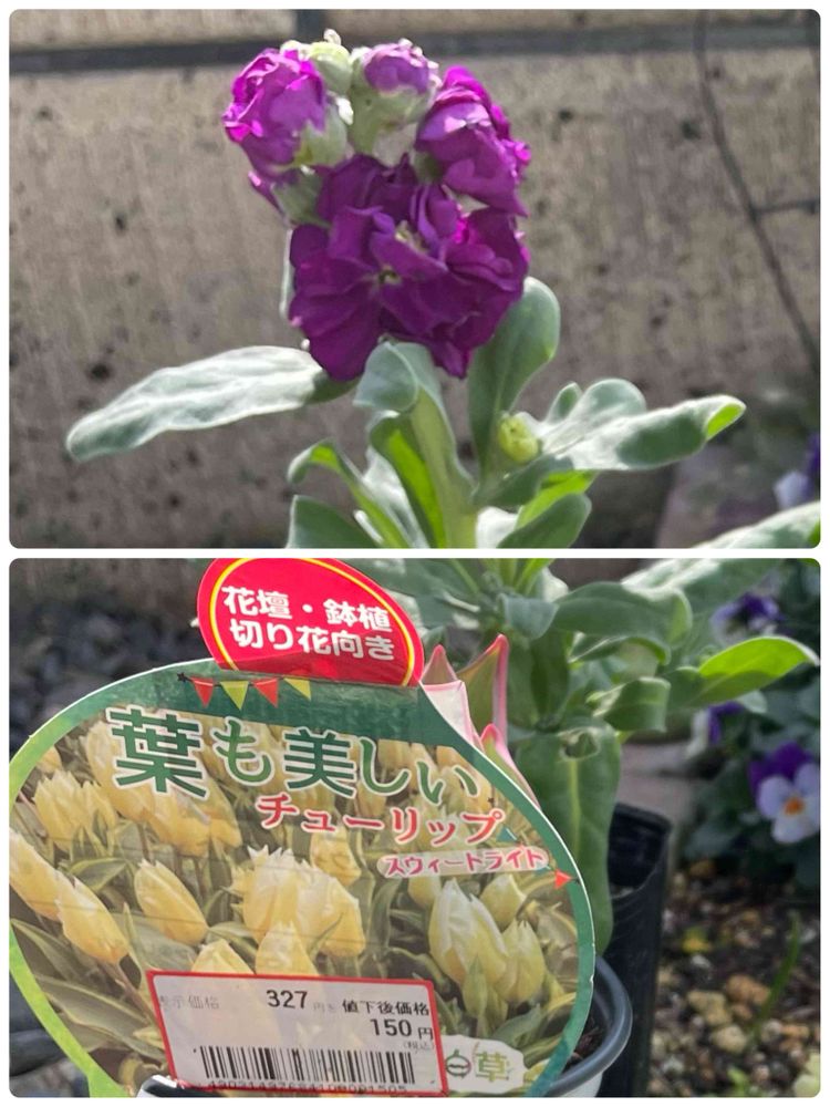 葉が綺麗なチューリップ🌷と紫ストック🪻300円でお持ち帰り