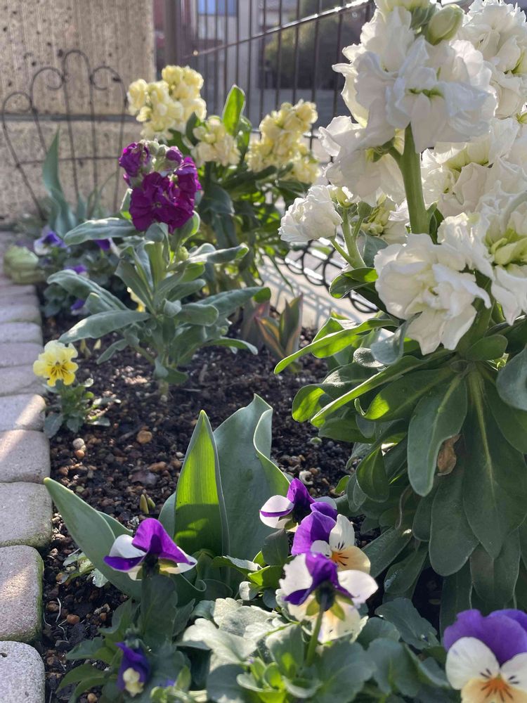 冬に植えた白黄色ストックとチューリップ球根の花壇