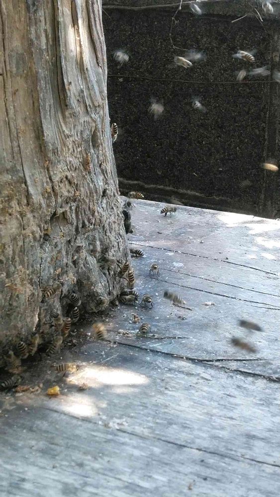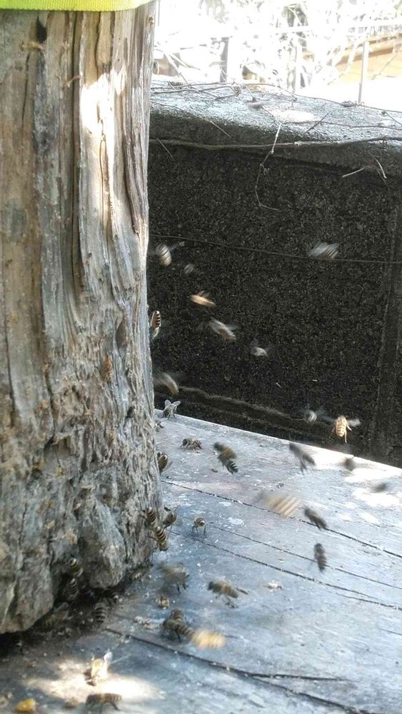 この前、空になってしまった日本ミツバチの丸太巣箱にたった今、何処からか飛んできた分蜂群が入居してくれました🐝🐝🐝😃👍✨🥰何日か前から偵察に来ていました。