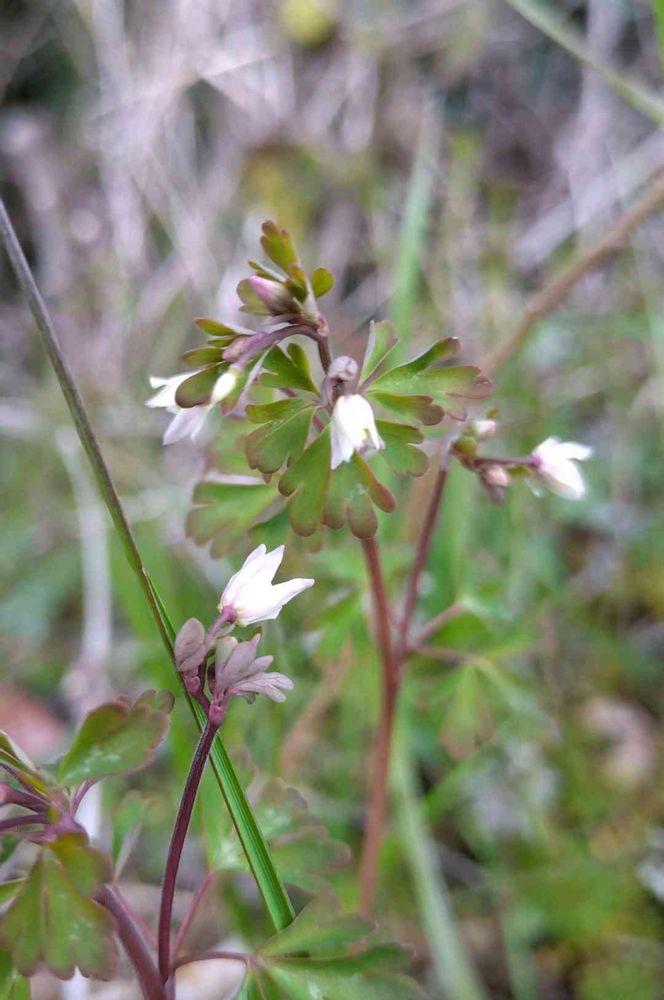 キンポウゲ科ヒメウズ属の多年草。日当たりのよい土手、道端、石垣の間などに生える。根生葉は3出複葉で長い柄がある。小葉は2~3裂し、裂片はさらに浅く2~3裂する。花期は3~5月。オダマキに似た5㎜ほどの小さくてほんのり紫がかった花を下向きに咲かせる。花弁のように見えるのは5枚の萼片で、中心で雄しべを筒状に囲んでいる部分が花弁。果実は袋果で、3~4個が花とは逆に上向きにつく。袋果には種子が10個ほど入り、風に揺れたり雨粒が当たると散布される。