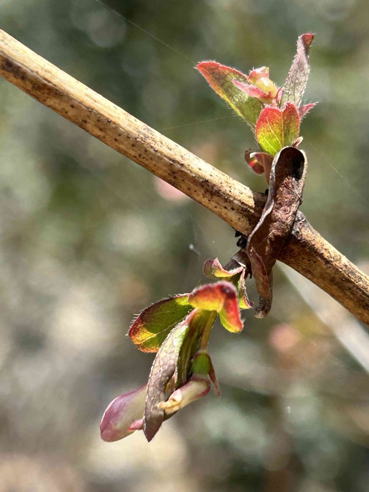 この幼木が、枝をズーンと伸ばし花と一緒に葉も出てきたのですが、こんな色です。赤みがあって可愛い💓