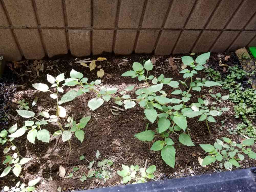 こぼれ種で育った食用ほおずきくんたち。チューリップ🌷花壇で生活中🏠。でもここは夏、日があまりささないので、どうなるかなあ⁉️