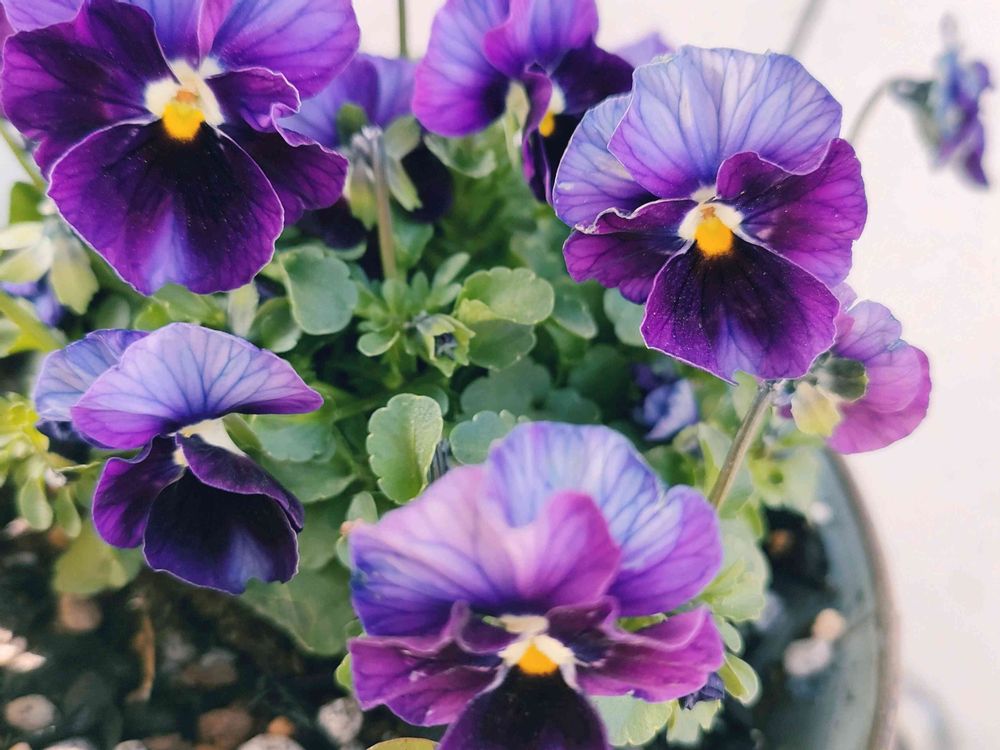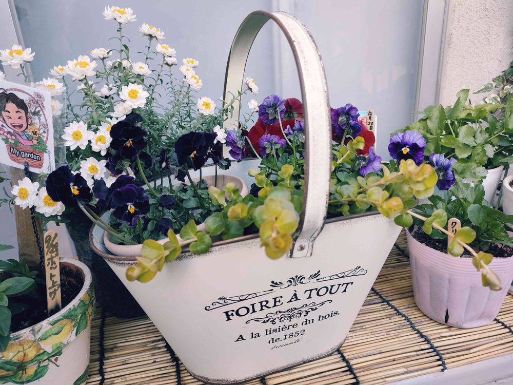ブラック、ブルーのビオラに合わせてオフホワイトのブリキ鉢を購入❤