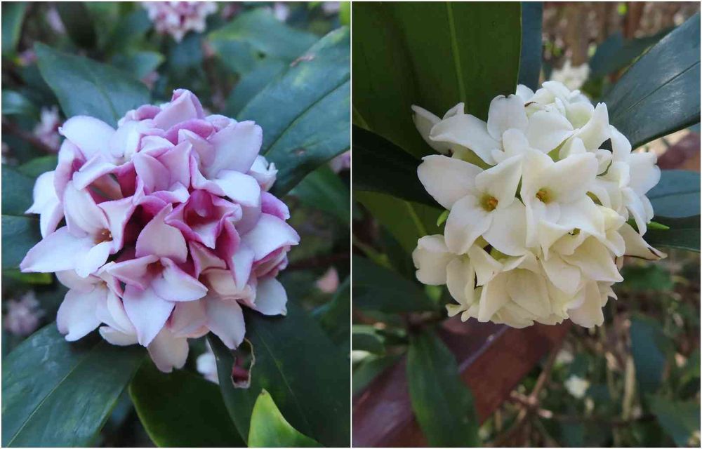 春の彼岸のお花「ジンチョウゲ」、赤と白に出会えました。 パチリ・パチリ