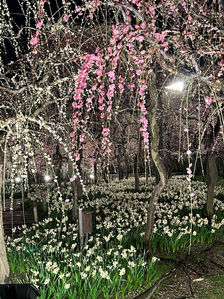 枝垂れ梅の赤、白、木の下にはは日本水仙がたくさん😊