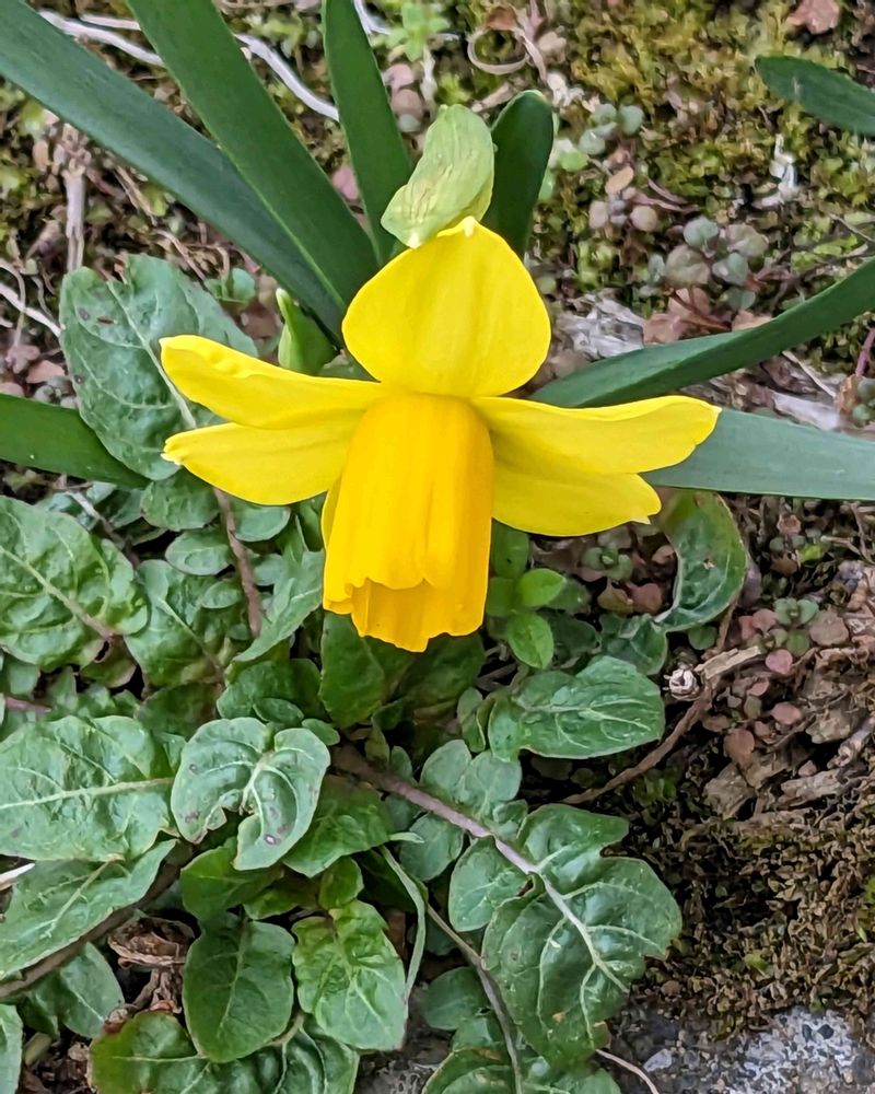 公園の枯れた芝生の中で10センチもみたない茎でお花を咲かす水仙可愛し健気
