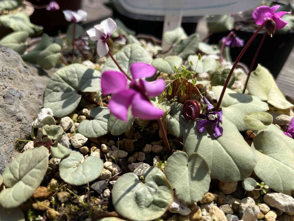 肝心の花がピンボケしてるけど、春咲シクラメンの原種、シクラメンコウム。花が咲き終わったら茎がくるくるになるんだって。