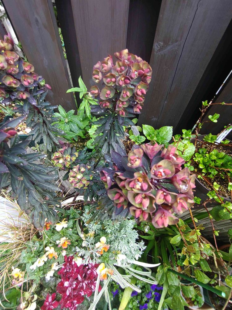 寄植えのユーフォルビアブラックバードが開花しそうです。切るタイミングを逃し、かなり間延びしているため、株元の花と間隔があき過ぎてしまいました。