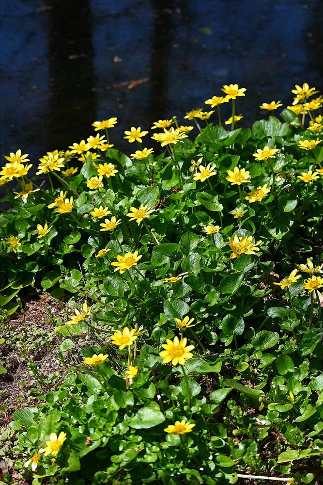 リュウキンカは沼地や湿地を好む多年草で、春先に咲きます。花弁に見えるのは「がく」の部分で、花弁はありません。茎が直立し、金色(もちろん純金ではありませんが)の花を咲かせることから、「立金花」と呼ばれます。陽光を浴びてピカピカ光る花弁状の「がく」はとてもきれいです。エナメル質にも見えます。