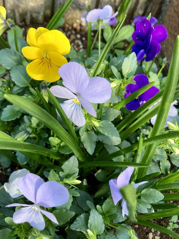 北側の玄関なので日当たりが悪く、あまり水はけも良くない花壇ではありますが、時々かろうじて届く太陽の光を頼りに、頑張って咲いてくれてます💜💛🩵