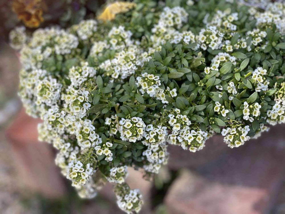 アンティークカラーのビオラと寄せたアリッサムが鉢から溢れ出しています✨