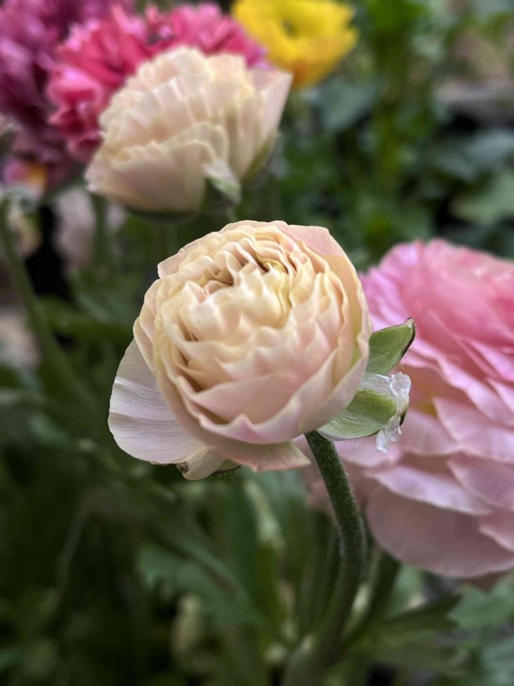 ラナンキュラス エトワール🤍🎀✨3/13にアップしたエトワールの脇芽がふっくらと膨らんで来ました🙌ちなみに頭頂花は右側に映り込んでいます…アプリコット色からピンク色に🤭