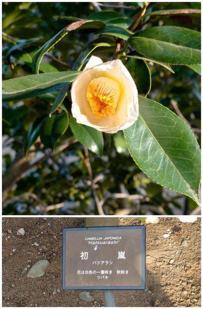 この初嵐というツバキは、秋咲きで、今月くらいまで楽しめるようです📖(農業試験場内にて)