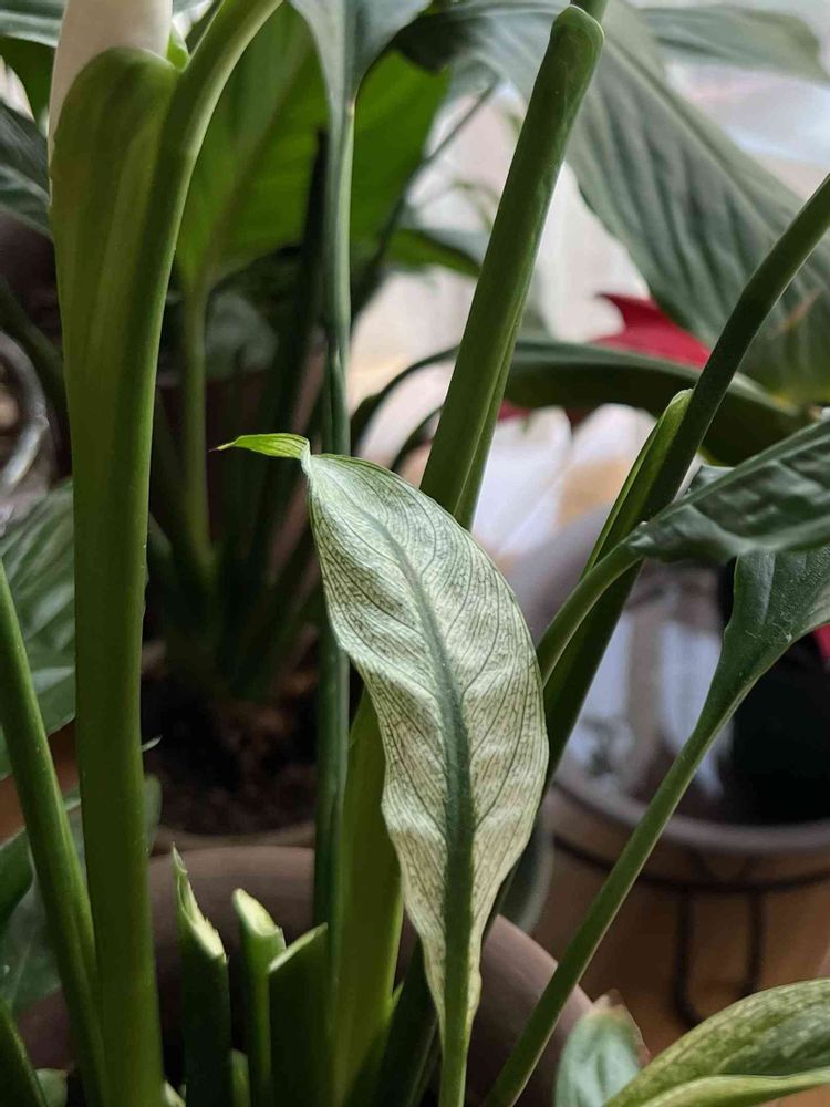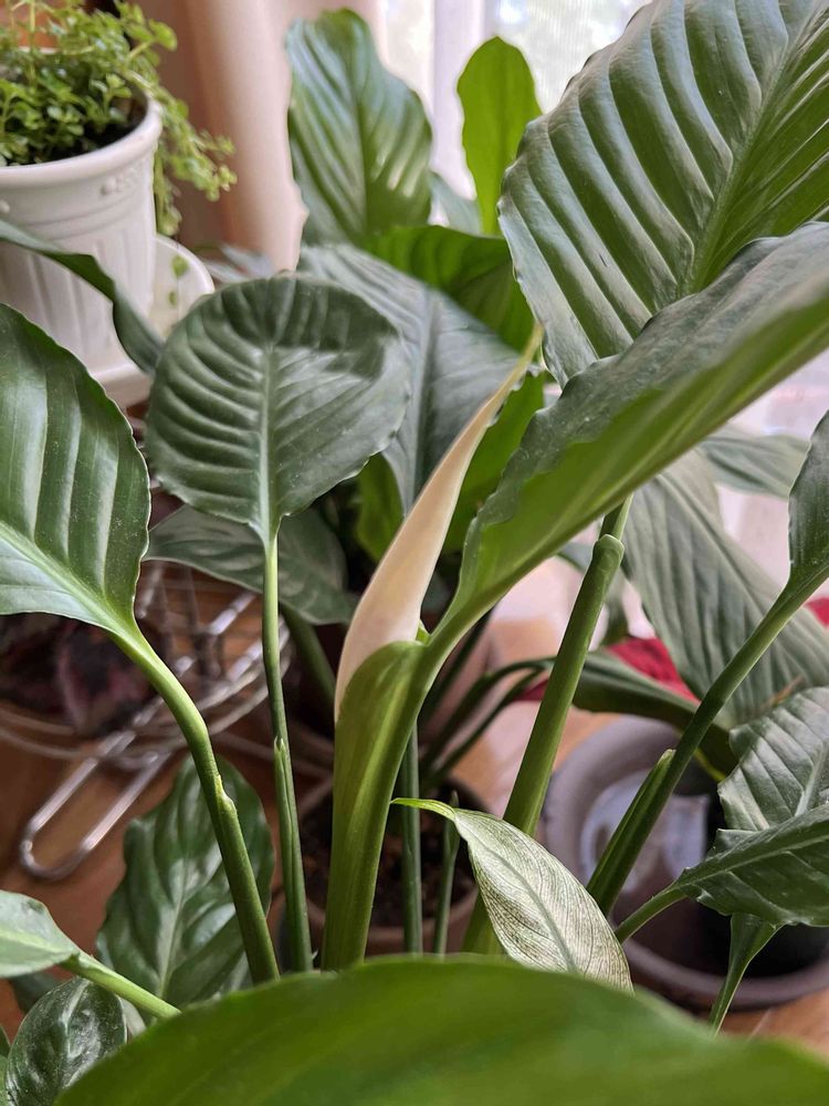 このスパティフィラムは、何年も前にDAISOで小さな鉢を100円で買ってきたのが、大きくなって→株分けして→花が咲いて…と、上品な姿の割にはコスパのよい植物です。育てやすいし。