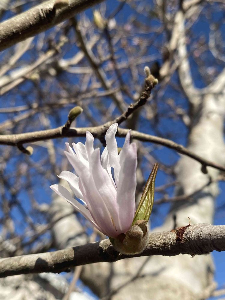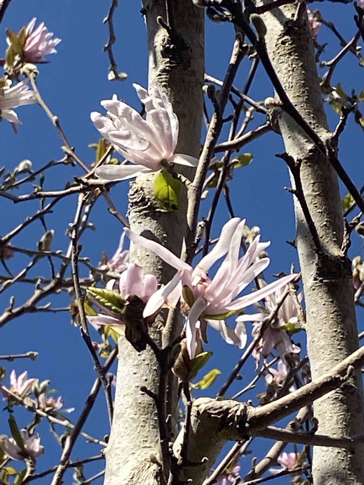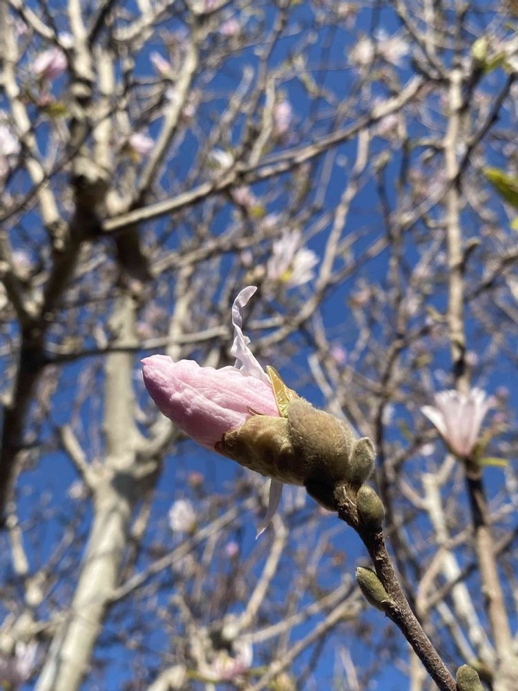 コシデコブシ、本当はもっと枝に沢山ピンクの花が付いているのに、上の方は殆ど🦜にかじられていました。
