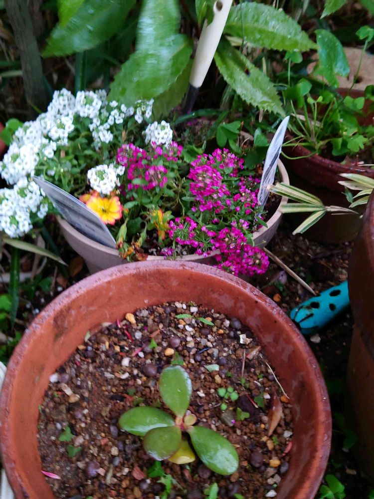 お義母さんの育てている 庭の木と 私の寄せ植えのアリッサムです