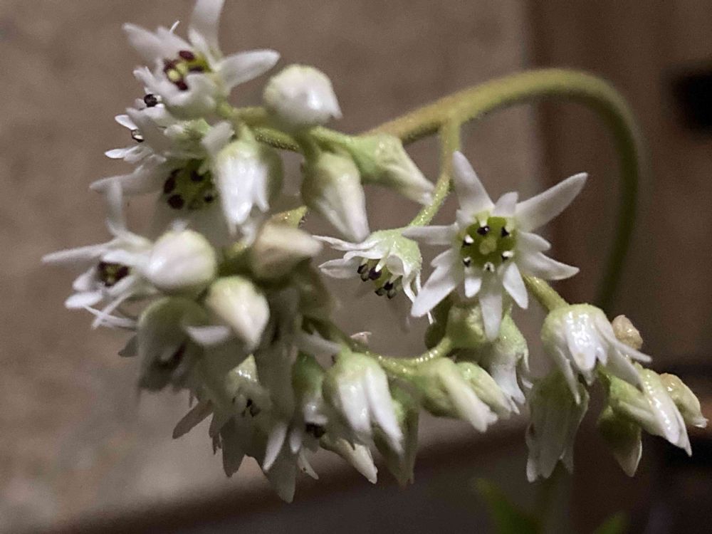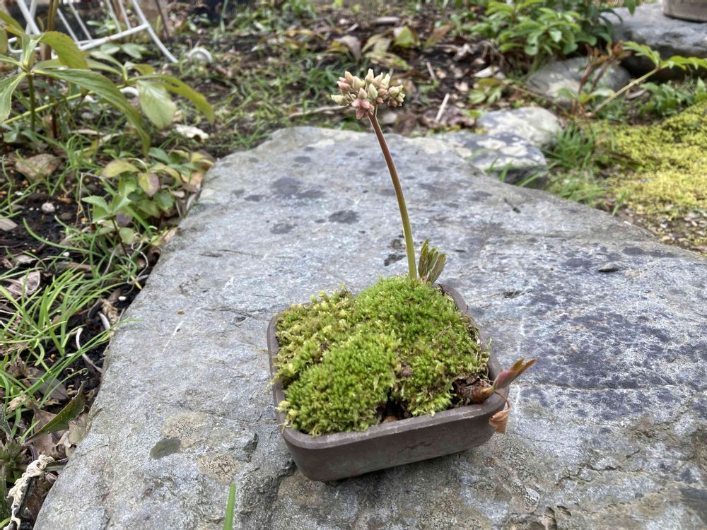 ①ミニ盆栽のイワヤツデが咲きました。