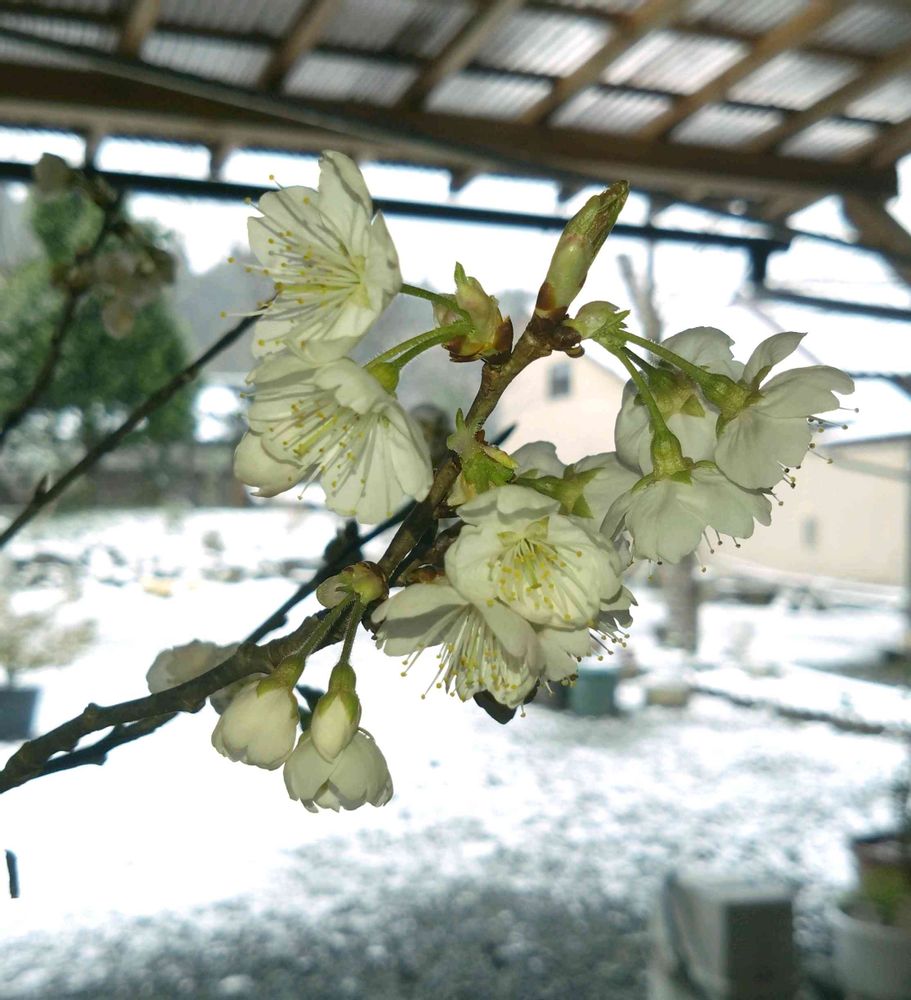 さくらんぼの花が、軒下で咲きました!