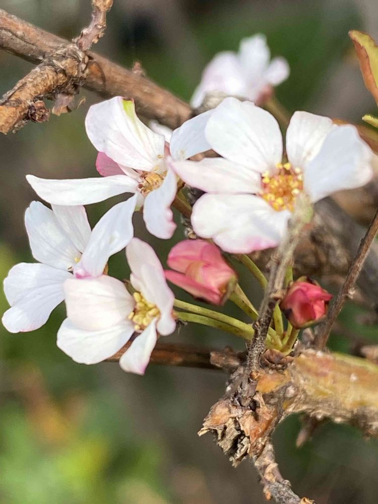 去年に剪定しすぎて枯れたのかと思ったけど、よーく見るとちょっとだけ咲いてたピンク雪柳、フジノピンキー🌸
