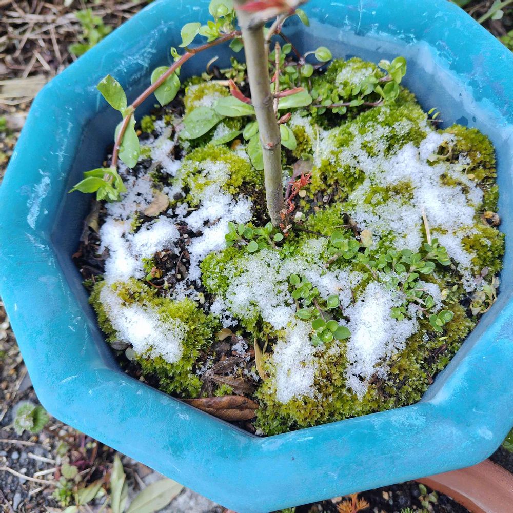 芽が出だした紅葉の鉢に、薄っすらと白い物が残っていました❄️