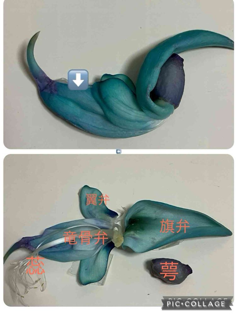落ちてるお花は持ち帰っていいそうで、家で分解してみました(3枚目)。こんなふうにに見えてマメ科なのでソラマメの花と同じ構造です。旗弁も竜骨弁も6cm程でした。⬇️の竜骨弁を押すと蕊がピョーンと飛び出る仕組みです。そしてコウモリがとまると身体に花粉が付き受粉するようです