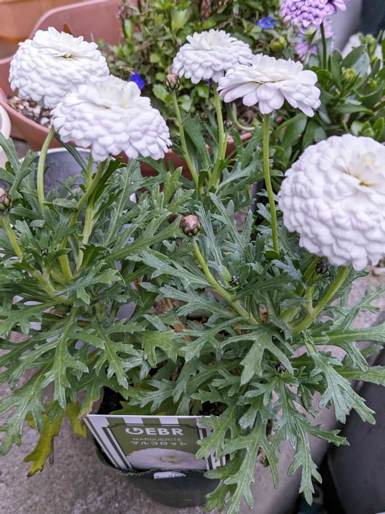 ローダンセマムは良い苗が多いタカザワフラワーファームのものが売られていたのと、色もホワイトカラーで色んなお花の中に入っても馴染みそうなのでお迎えしました🎶🎶