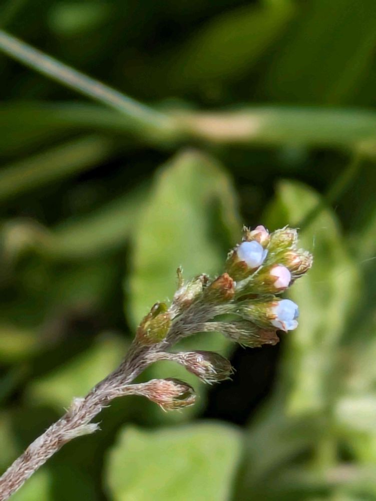 キュウリグサと思われる草に花が咲いていました。花の直径は約2ミリ、花の中心は黄色、花を支える葉身は約2.5センチ。