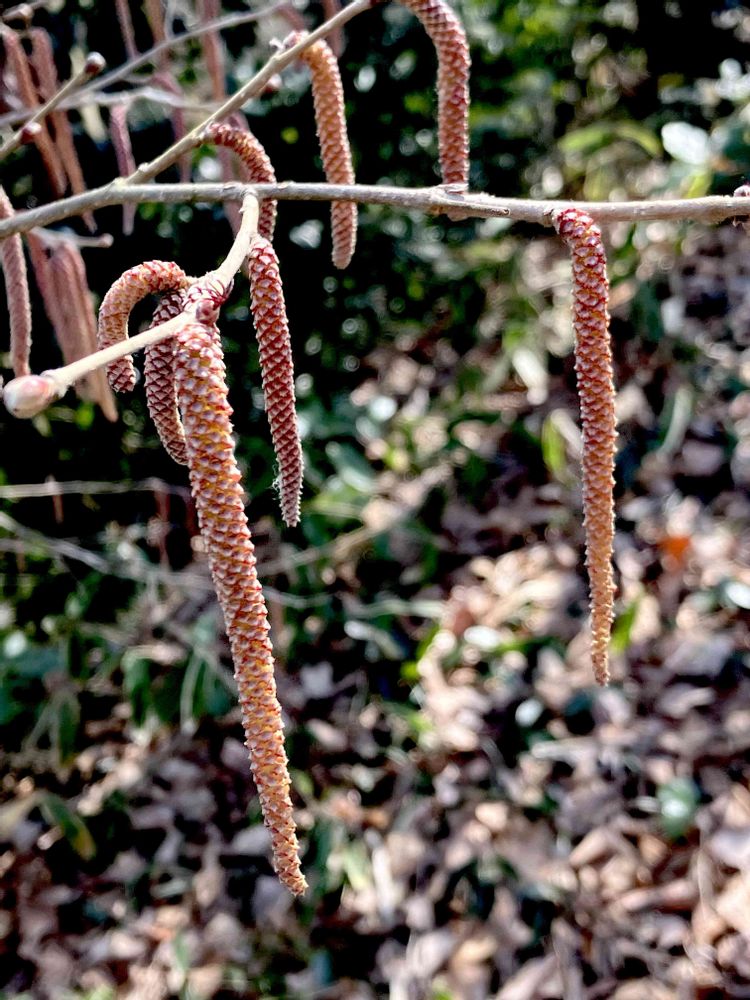 ①②③秋に出来ていた硬い雄花序がほどけて、赤い雌花の柱頭が見えてきました。小さなイソギンチャクのようです❣️