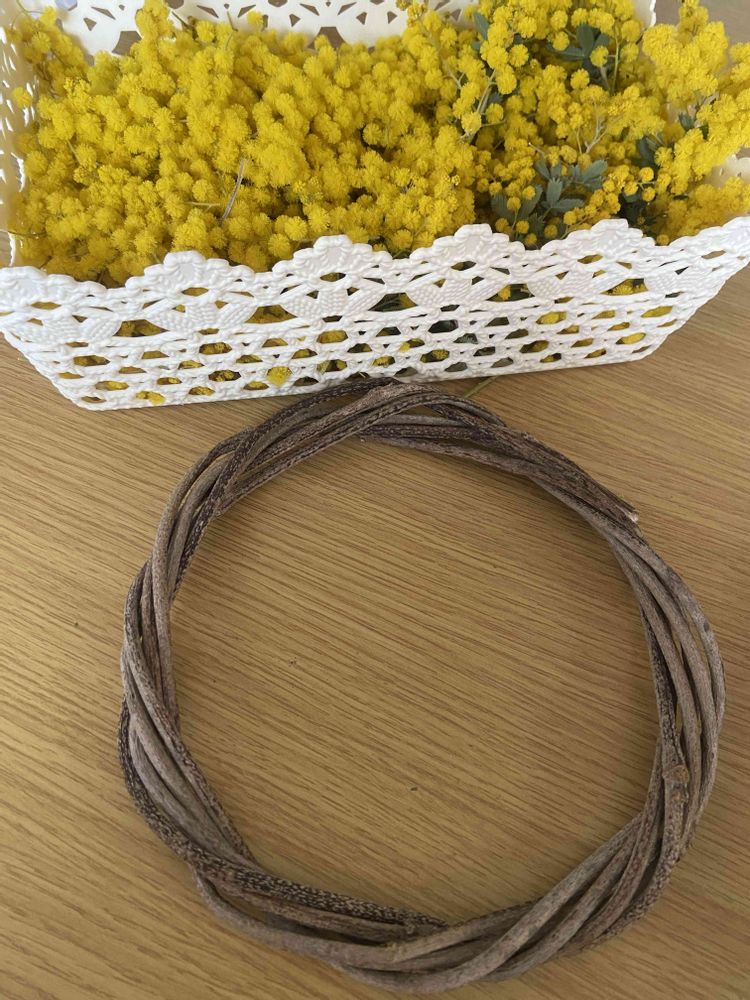 久々に大きなミモザのリースを作りました♪土台も丘の上にあったツタの蔓をくるくるして作りました。その丘にミモザいっぱいにする?!最後の写真は挿木をしようかと水切り中。