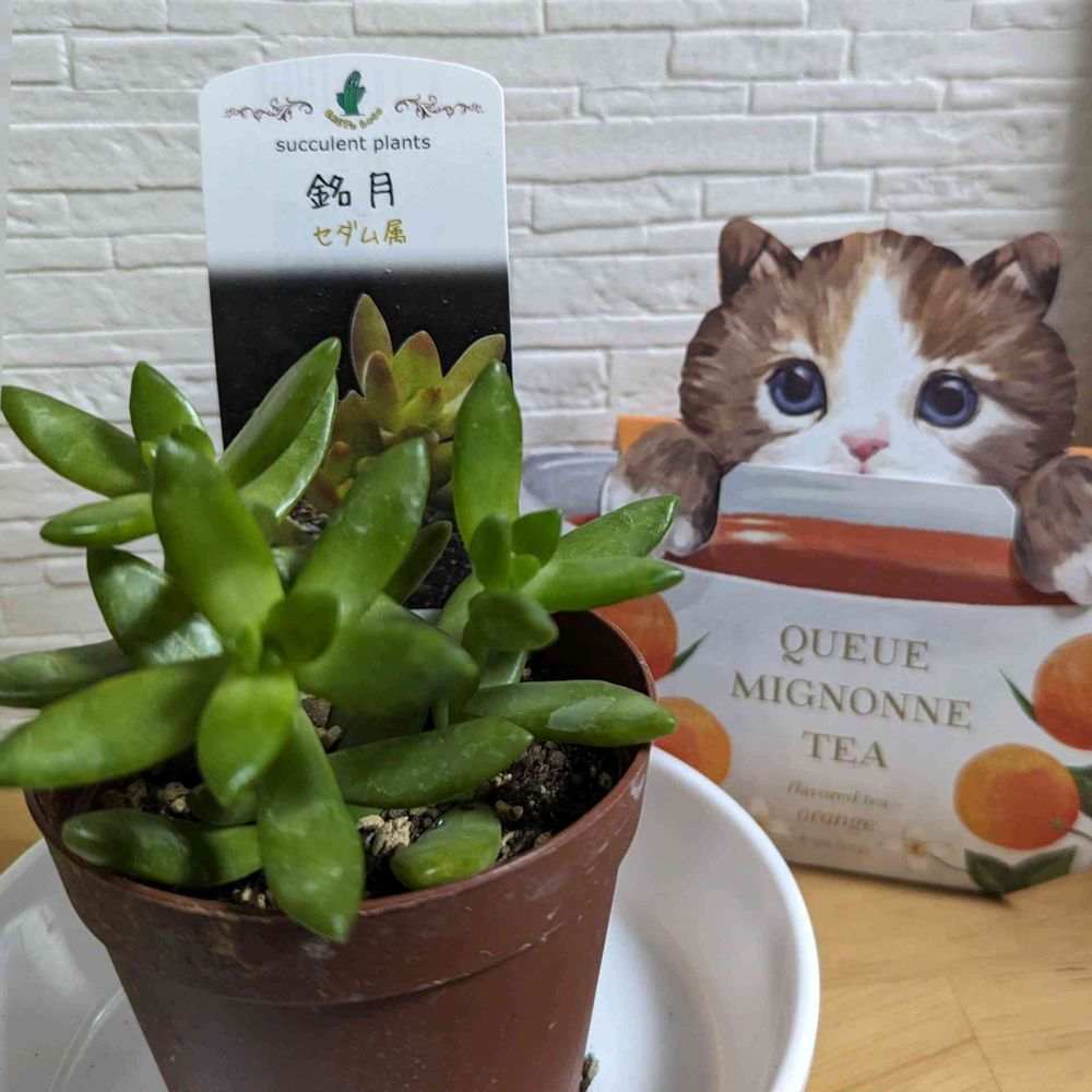 セダム属の💚銘月💚は光沢のある尖った多肉質の葉が特徴ですが、じっと見つめるネコちゃんが可愛いでしょ😍💖