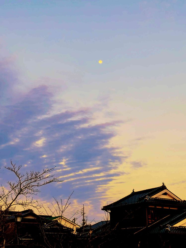 買い物の帰り道で,夕暮れの空と月の投稿画像