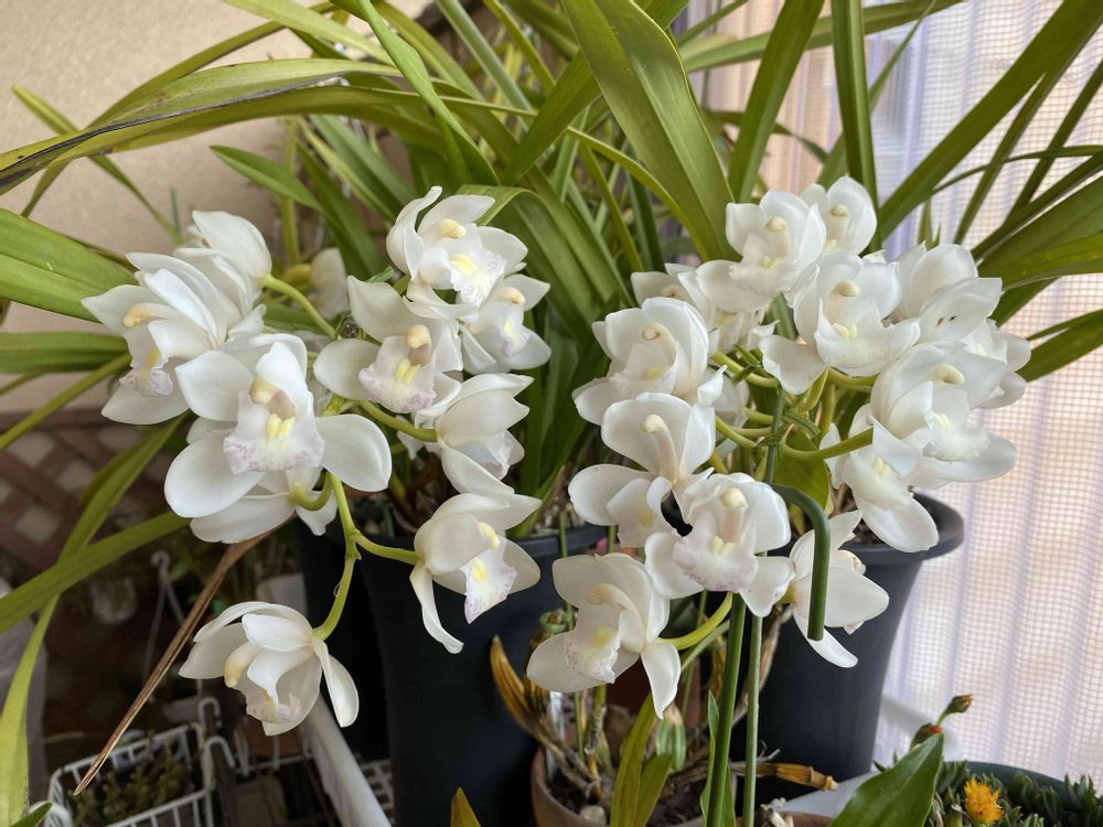 シンビジューム サラジーン ’アイスキャスケード’が咲きました。株分けして去年は咲きませんでしたが今年は咲きました♪また、大株に挑戦しようかな(^.^)