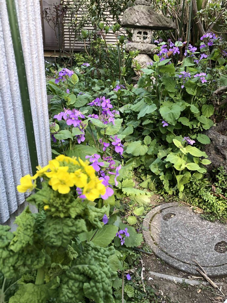 自宅中庭の通路に今年も✨菜の花と✨ハナダイコンの花が咲き始めました♪😊
