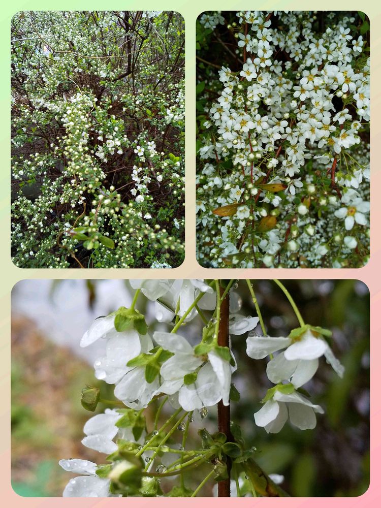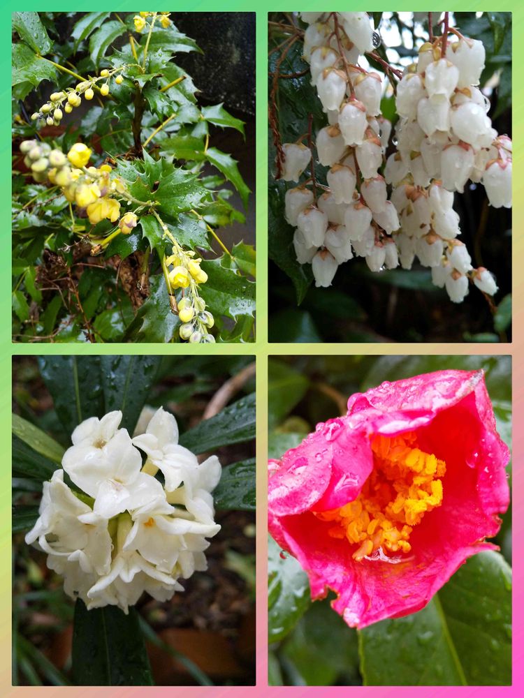 4枚目は雨の庭の柊南天、馬酔木、沈丁花、椿