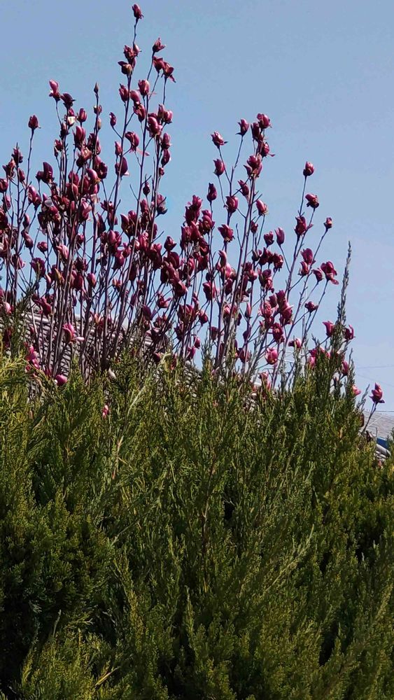 赤い木蓮は白い木蓮より地味だけど、花びらを表も裏も見せてくれるし、高いところに咲いて見守ってくれているような気がする。