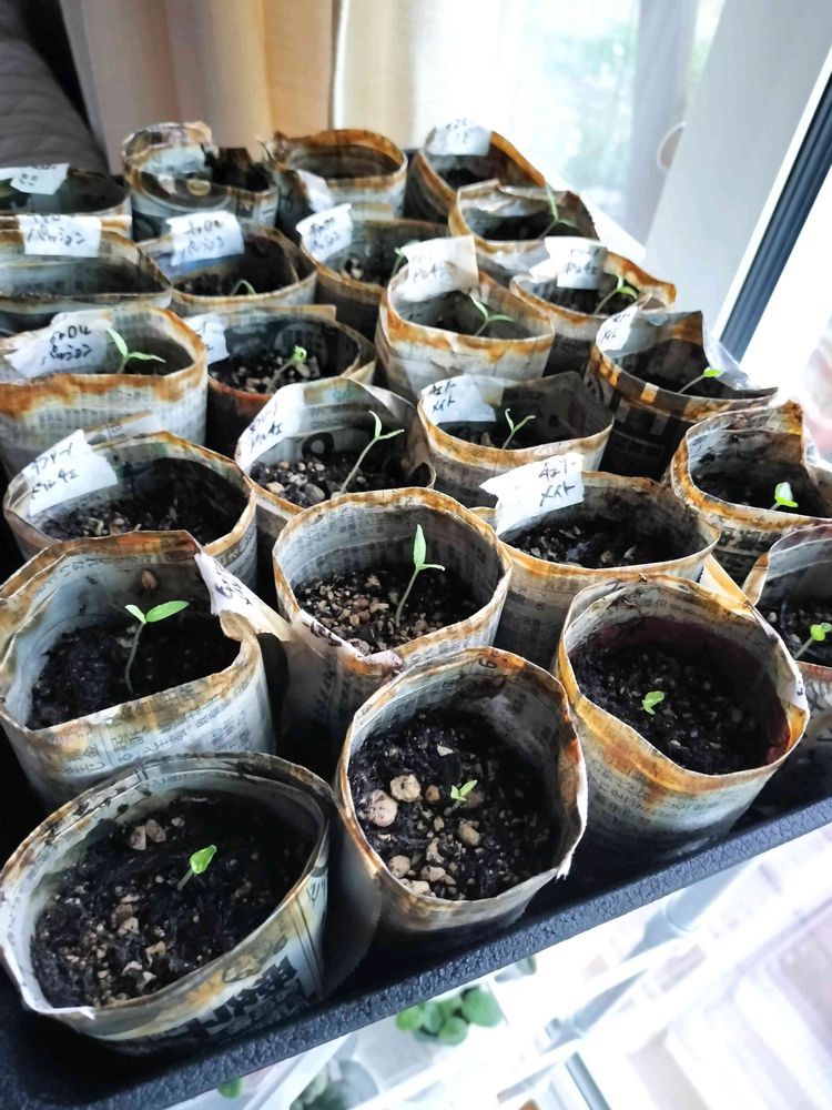 ミニトマト&アルセアだいぶ芽が出ました。ここまでは簡単。ミニトマトは冷蔵庫保管の期限切れ種でも余裕の発芽率でした。あとは回したり土を足したりしてしっかりするまで育てます。