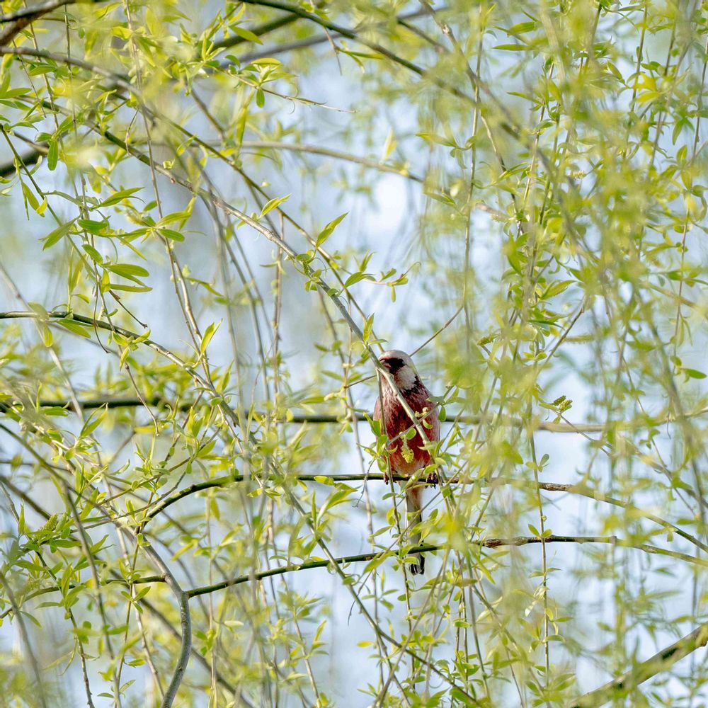 近くの公園の柳の木も春の訪れ・・・新芽がいっぱい青々と色づいてきました。その新芽を食べていたのはベニマシコ(雄)でした。