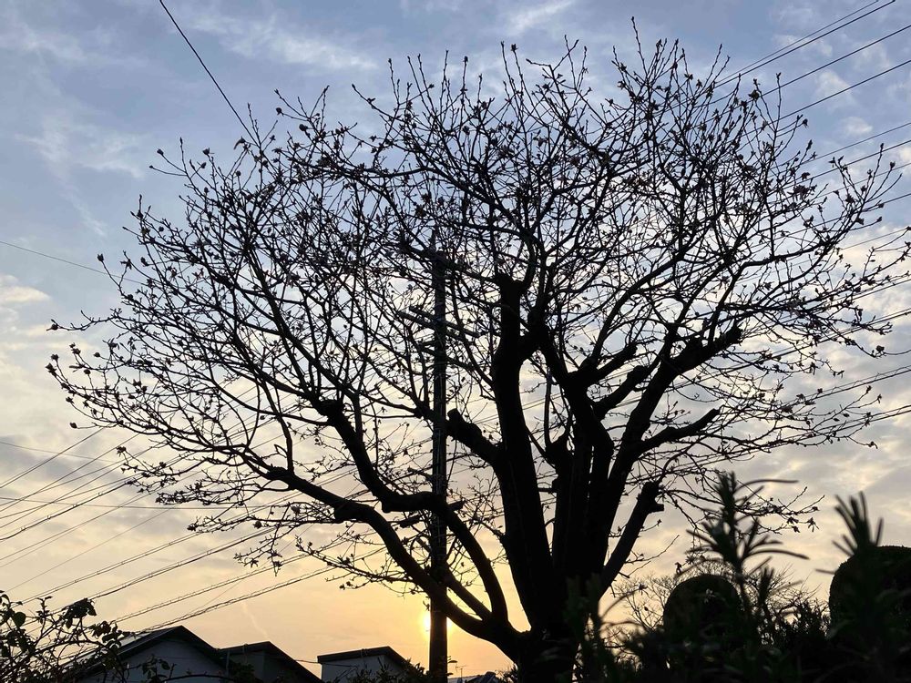 夕暮れのヒメコブシを包みこむ