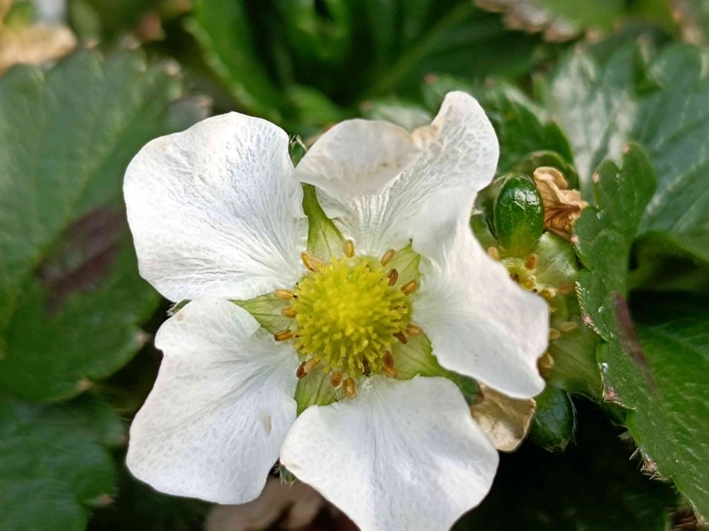 苺🍓の花も、こうやってアップにすると、柔らかな花びらや黄色い蕊が可愛らしいですね🥰