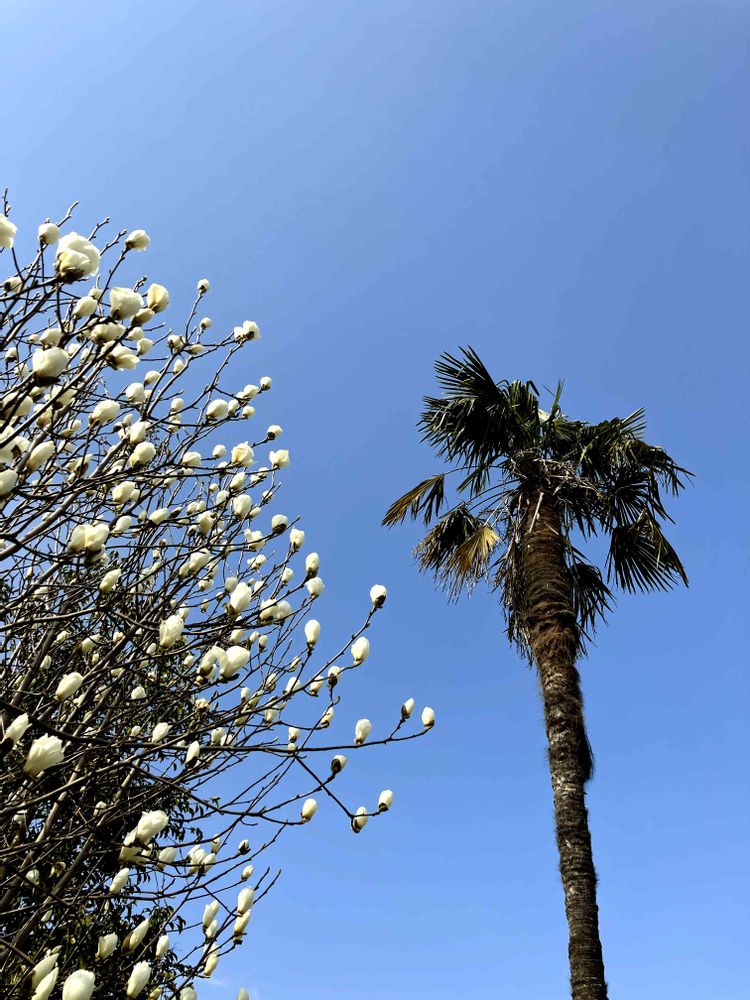 青空に🟦シュロと,木蓮の白がキレイ😍