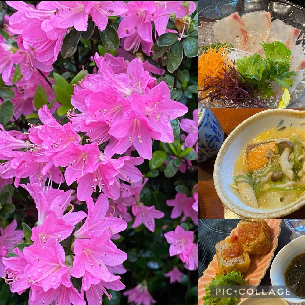 ☘️クルメツツジ☘️....かわいいな💕アラザンみたいな銀粒が光りながら、こんな鮮やかにびっしりと咲き出してきたよ🌸右側はホテルランチの和食膳。鯛のお造り。鮭・豚肉・きのこの味噌鍋。トマト味のキャベツ挟み揚げ。ほうじ茶プリン🍮などでした✨🍵🥢✨