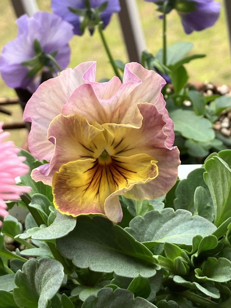 今日のビオラはこちら。黄色が強くてちょっと苦手な色合いの花が咲きました。