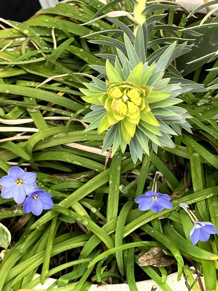②ハナニラ🩵と上の鉢からのユーフォルビア ミルシニテス💛