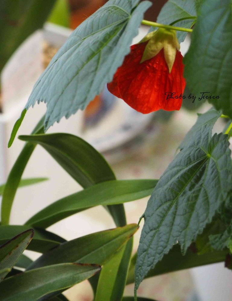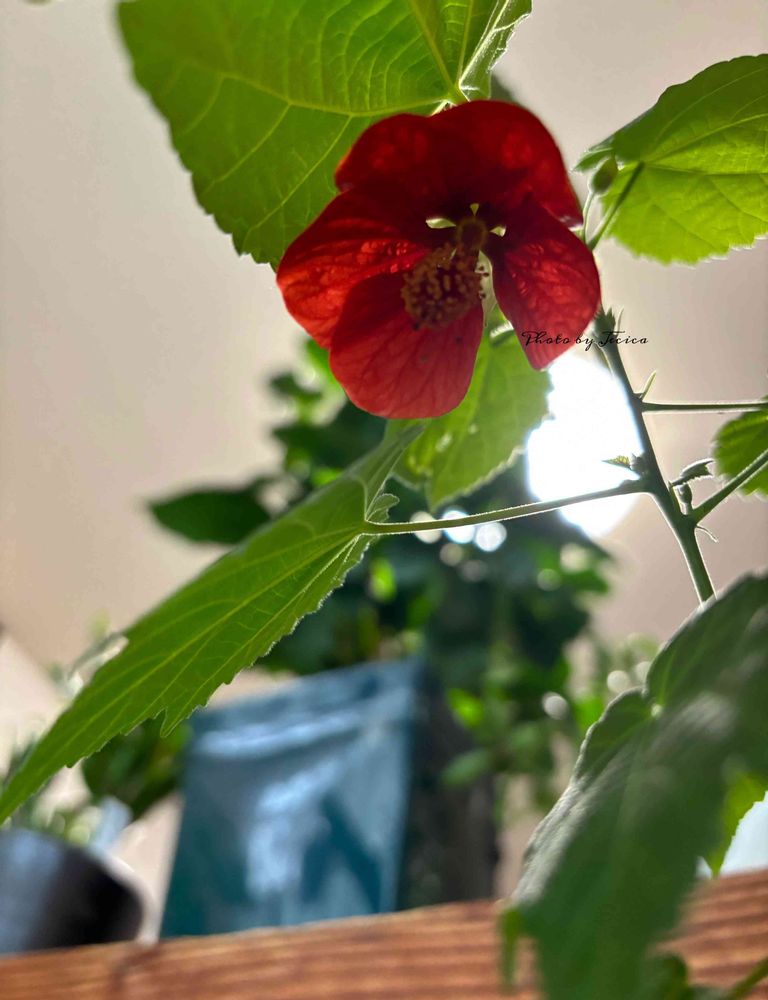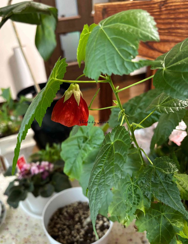 寒い間、リビングの明るい場所で管理していたアブチロン.’姫りんご’が咲いています