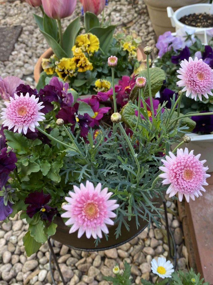 花の寄せ植え、私も苦手意識あります。多肉植物より更に難しい気がします。マーガレットを主役に春らしいイメージの寄せ植えでいいですね。( ᴖ ·̫ ᴖ )