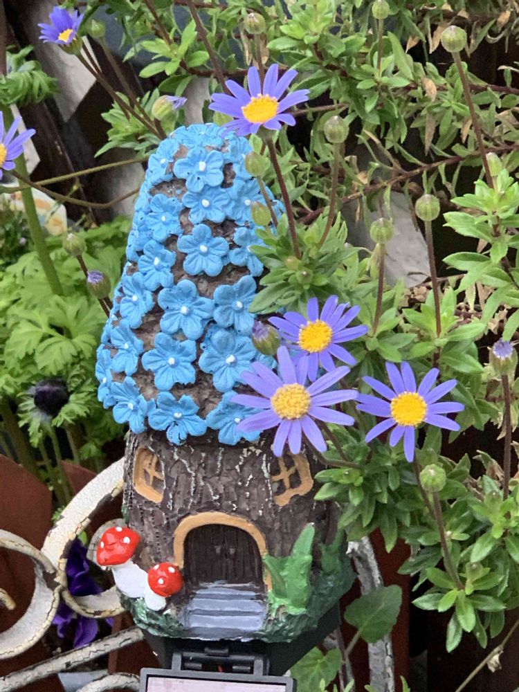 玄関ポーチの可愛いソーラーライトと2月に一輪だけだった2年目のブルーデージー💜
