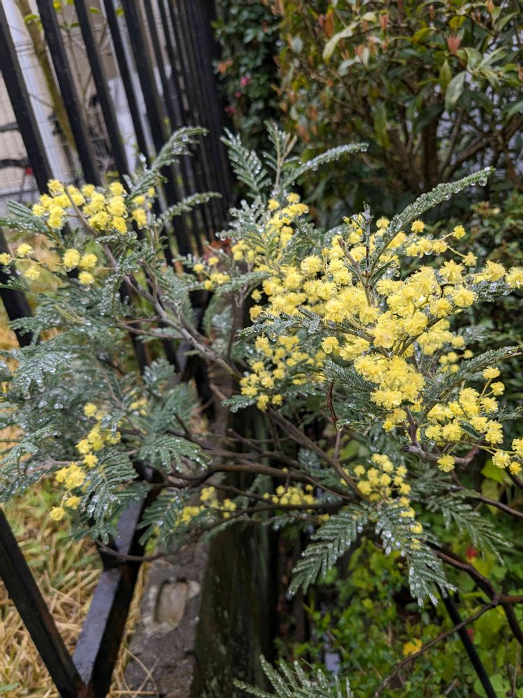 雨に打たれし鉢植えミモザも情緒有るね〜✌️👀🎶