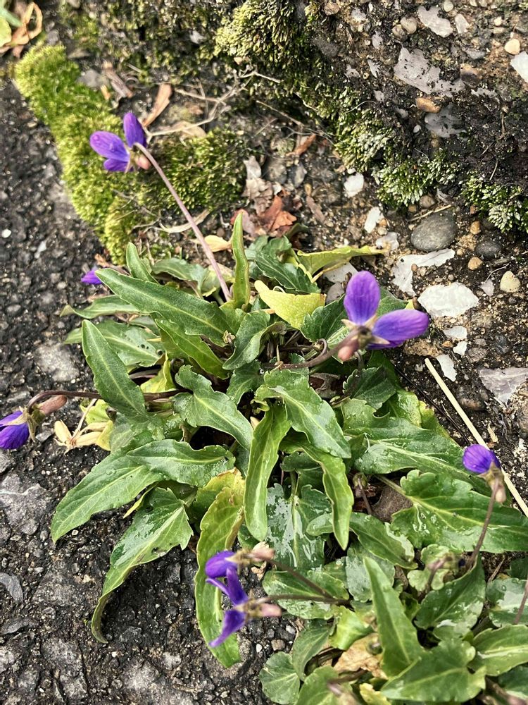 近所の道端で咲いてるヒメスミレ。花径は小指の爪の長さくらいで小さいから分かりやすいです。花色は濃いめの紫で側弁基部に毛があります(写真2)葉っぱは三角状で先が尖った披針形です。今は長さ3cmぐらい(写真3)だけど夏になると大きくなっていて驚きます。3/23撮影